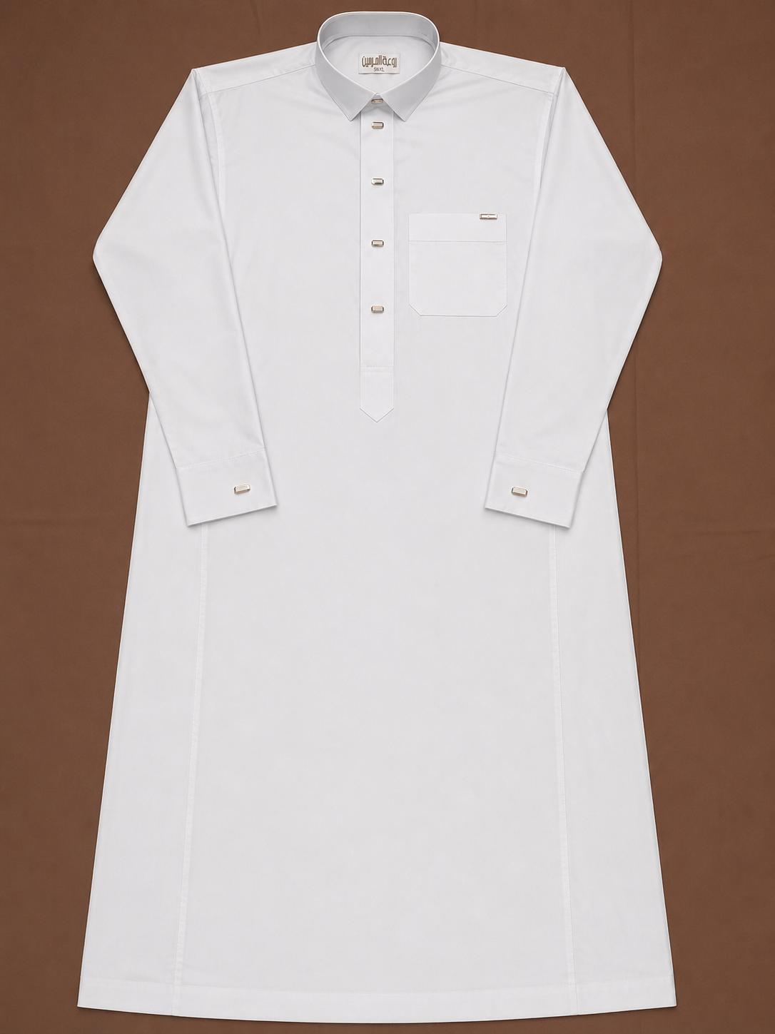 Trang phục được cấu trúc theo hai lớp cao cấp: lớp trong là Thobe trắng cổ đứng truyền thống, sử dụng cotton cao cấp mềm mịn và đứng form; lớp ngoài là Bisht hoàng gia làm từ vải sheer cao cấp, nhẹ và rũ tự nhiên, được viền thêu chỉ vàng thủ công tinh xảo. Thiết kế Bisht tay rộng với đường thêu vàng chạy dọc thân áo và cổ tay, kết hợp họa tiết thêu dày ở ống tay như biểu trưng cho địa vị và đẳng cấp. Tổng thể mang phong cách Royal Ceremonial Wear, lý tưởng cho các nghi lễ trang trọng, sự kiện cấp cao hoặc không gian mang tính hoàng gia. Khi phối cùng khăn đội đầu ghutra trắng, agal đen truyền thống và đồng hồ kim loại mặt xanh, trang phục càng tôn lên phong thái quyền uy; bối cảnh studio nền tối cùng ánh sáng tập trung giúp làm nổi bật chiều sâu, cảm xúc và sự trang nghiêm của sản phẩm.